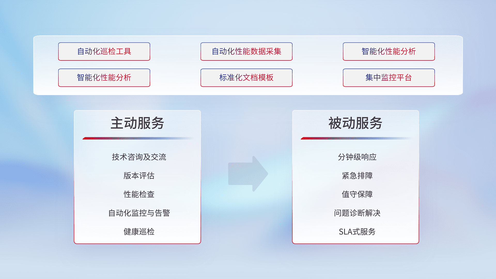 智能化工具和标准化文档,,,,保障服务质量,,提供主动服务(包含技术咨询、、、、版本评估、、、性能检查、、自动化监控与告警、、、、健康巡检)和被动服务包含(分钟级响应、、紧急排障、、、值守保障、、、问题诊断解决、、、、SLA服务)。。