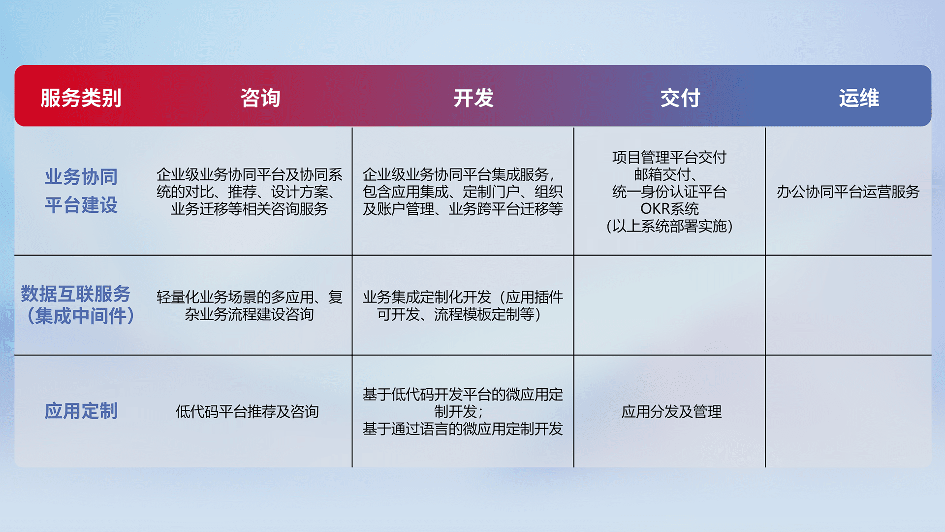 针对钉钉、、、企微、、、IDaas等平台级产品提供产品的规划、、、、方案、、、、交付、、定制化开发等服务,,,实现如统一协同办公、、、智能客户服务、、混合会议管理、、智能数据查询、、、等业务场景,,,,实现数字化转型。。